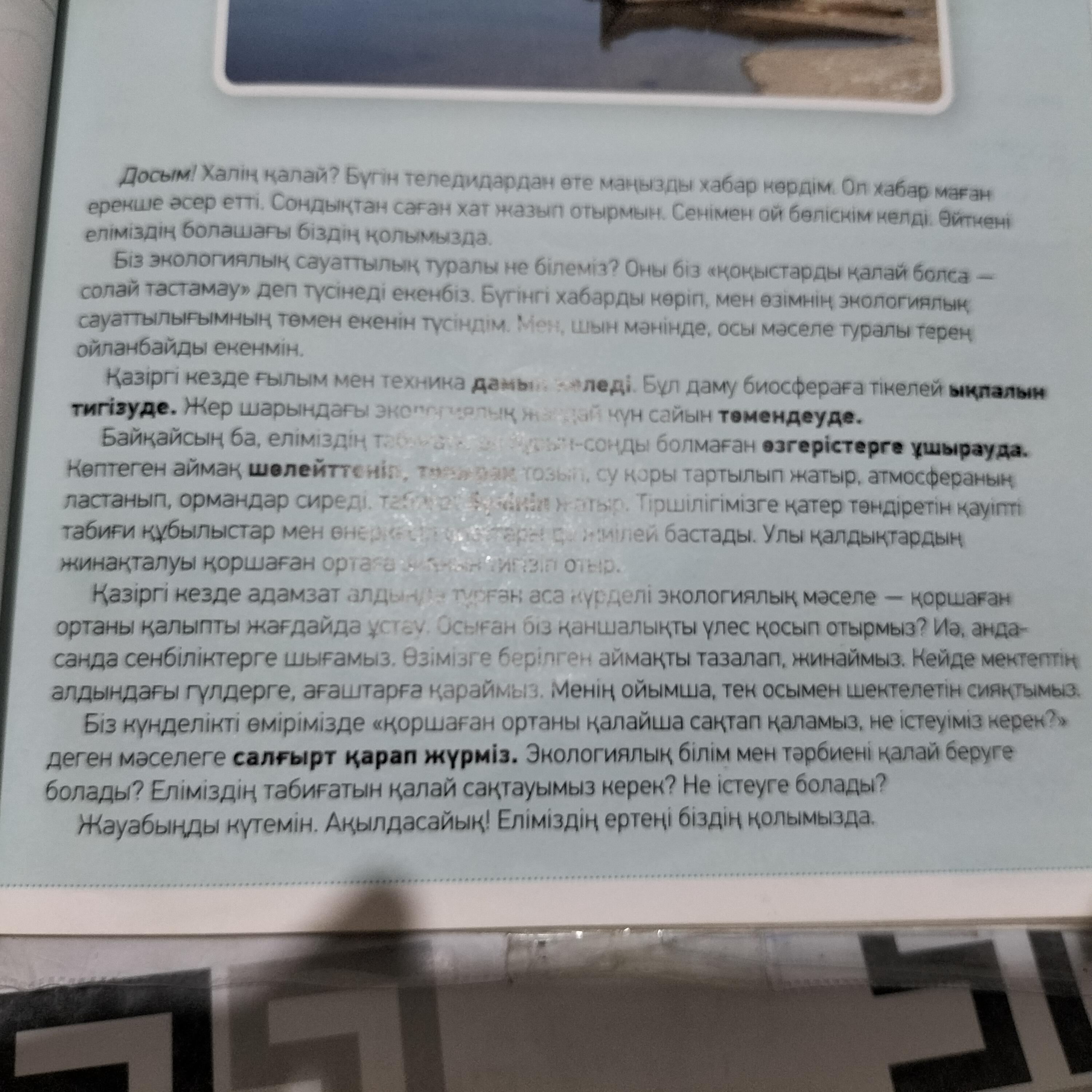 тигiзуде. Жер шарындагы экологиялыдай нун сав г мендеуде. Байкайсын ба, еліміздің таб жаты да бурын-соңды болма arepicrepre ушырауда.
