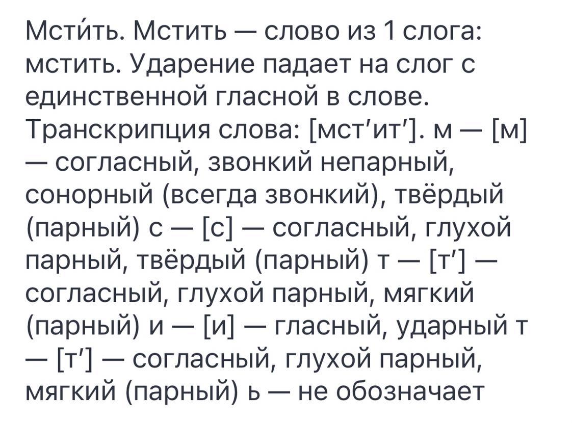Мсти́ть. Мстить — слово из 1 слога: мстить. Ударение падает на слог с единственной гласной в слове. Транскрипция слова: [мст’ит’]. м — [м] — согласный, звонкий непарный, сонорный (всегда звонкий), твёрдый (парный) с — [с] — согласный, глухой парный, твёрдый (парный) т — [т’] — согласный, глухой парный, мягкий (парный) и — [и] — гласный, ударный т — [т’] — согласный, глухой парный, мягкий (парный) ь — не обозначает
