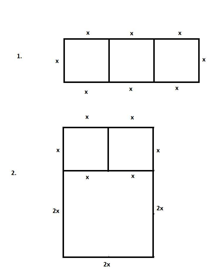 1. Три одинаковых квадрата со стороной x образуют прямоугольник с измерениями x и 3x.