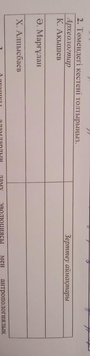 2. Төмендегі кестені толтырыңыз. Археологтар К. Ақышев Зерттеу аймақтары Ә. Марғұлан X. Алпысбаев