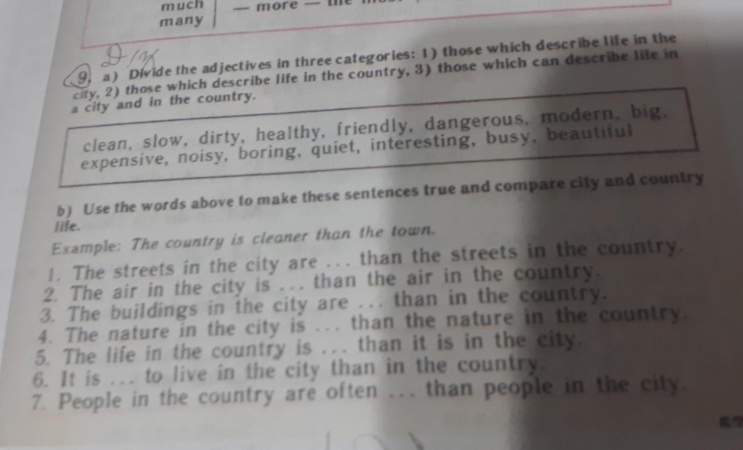 A) Divide the adjectives in three categories:1) those which describe life in the city,2) those which describe life the country,3) those which can describe life in a city and in the country.clean,slow,dirty, healthy, friendly, dangerous,modern,big, expensive, noisy,boring,quiet, interesting,busy, beautiful.