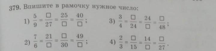 379. введите в рамояку нужное число 1) 5/9= */27 = 25/* = 40/* 2) 7/6 = 21/* = */30 = 49 /*