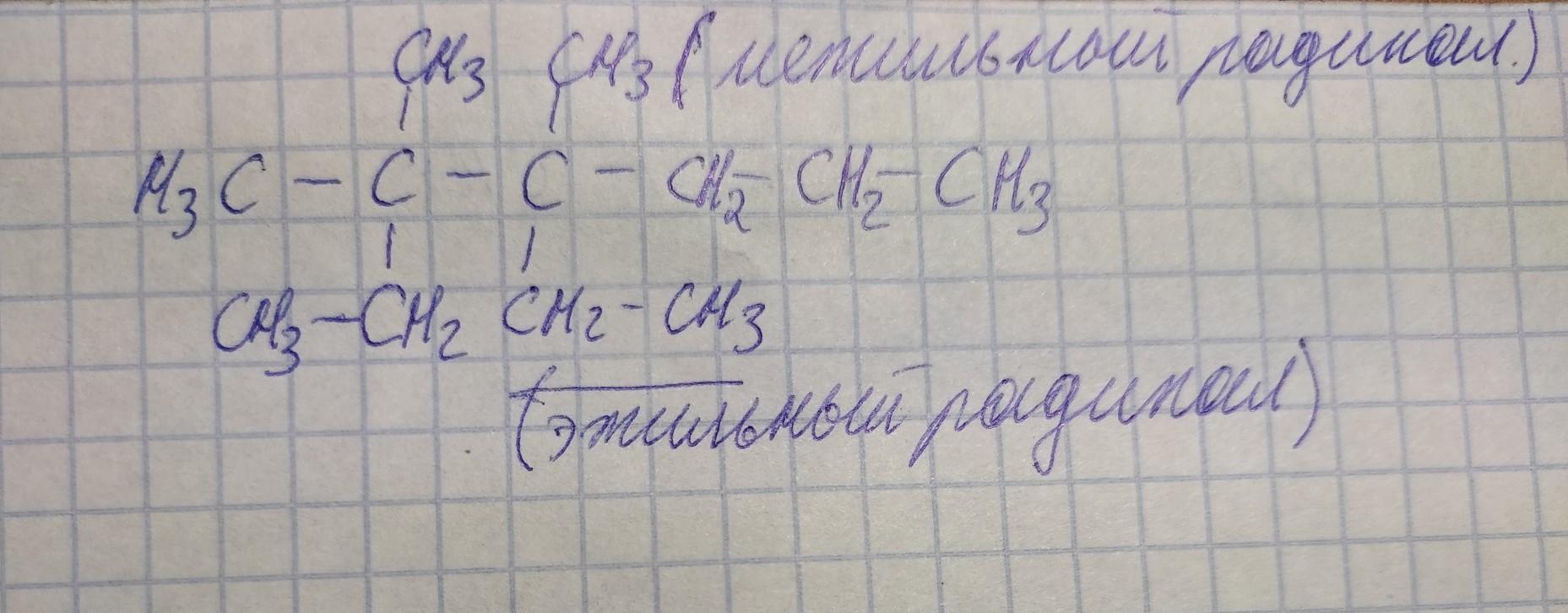 если пронумеровать углеродную цепь, то получиться, что радикалы сядут на второе и третье положения, т. е. там где радикалы водородов не будет. На фотографии я написал структурную формулу. Этил по массе будет тяжелее, чем метил, поэтому будет снизу.