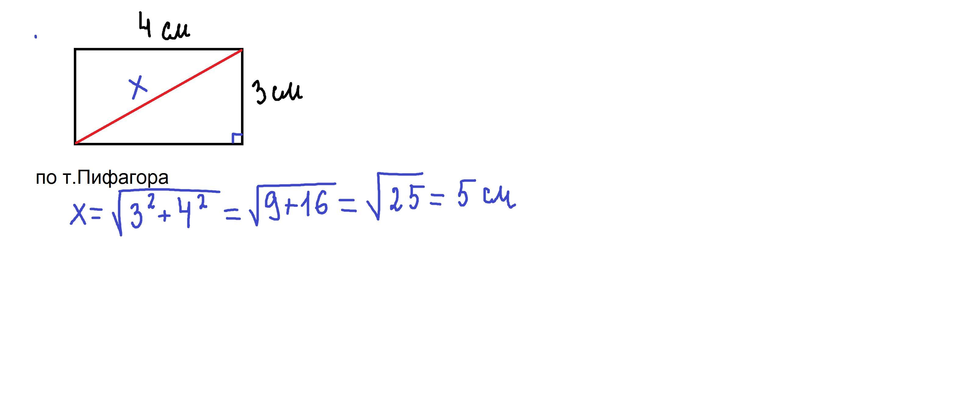 диагональ делит прямоугольник на два прямоугольных треугольника,в котором катеты равны 3см и 4 см,По т.Пифагора можем найти Х.