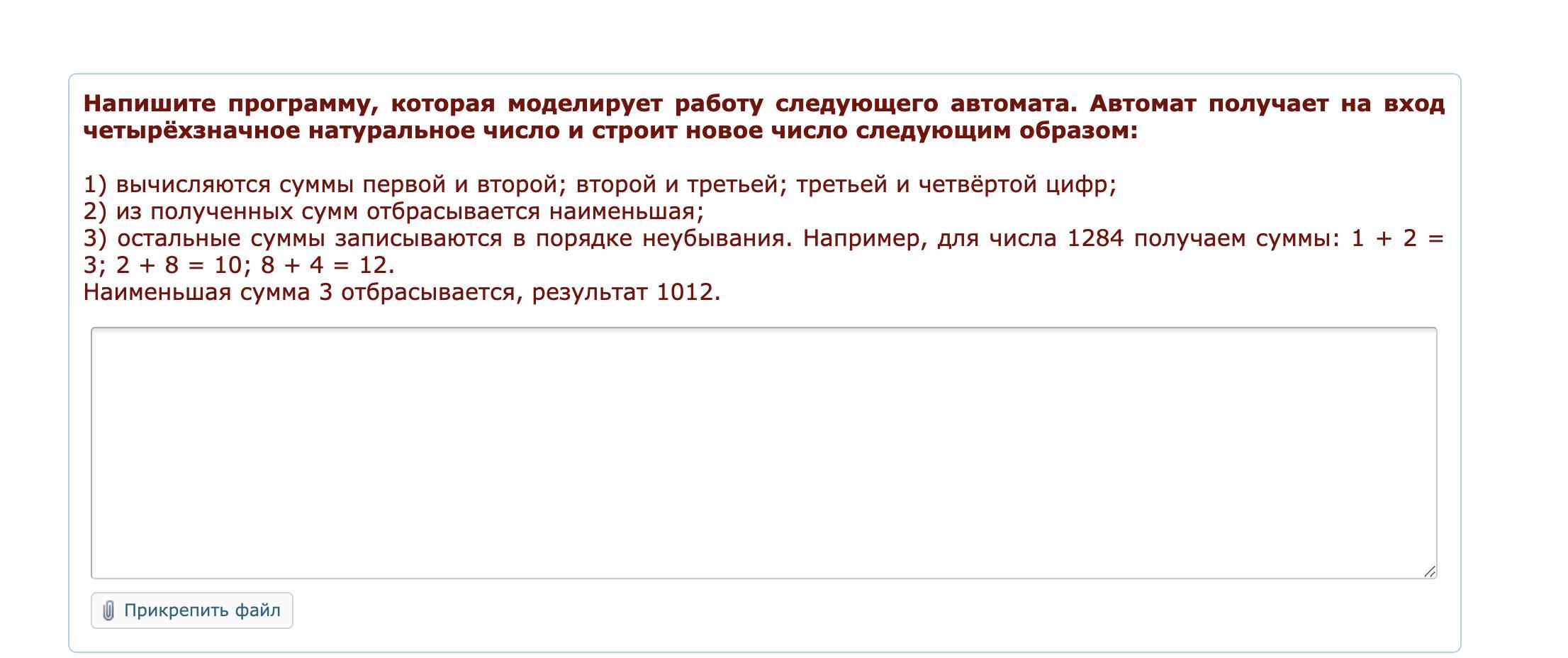 3) остальные суммы записываются в порядке неубывания. Например для числа 1284 получаем сумму 1 + 2 = 3 ; 2=8=10; 8+4=12