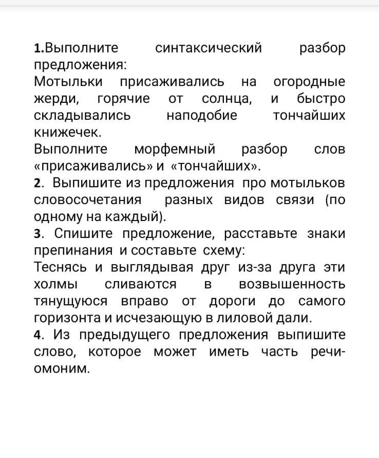 1. Мотыльки( подлежащее) присаживались (сказуемое) на огородные (определение) жерди( дополнение) , горячие от солнца ( приложение , подчеркивается волнистой линией) , и быстро ( обстоятельство) складывались ( сказуемое) наподобие (обстоятельство) тончайших ( определение) книжечек(дополнение)
