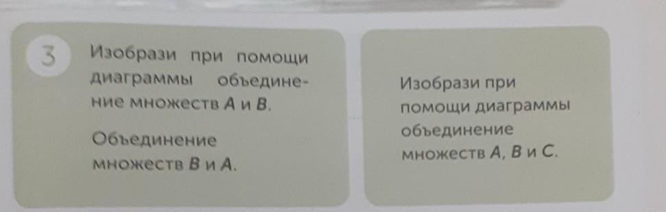 3 Изобрази при помощи диаграммы объедине- ние множеств А и В. Изобрази при помощи диаграммы объединение множеств A, B и C. Объединение множеств в и А.