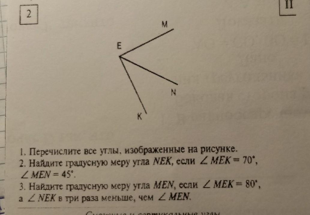 1. Перечислите все углы, изображенные на рисунке. 2. Найдите градусную меру угла NEK, если 2 MEK = 70*, Z MEN = 45°. 3. Найдите градусную меру угла MEN, если Z MEK = 80°, az NEK в три раза меньше, чем 2 MEN.