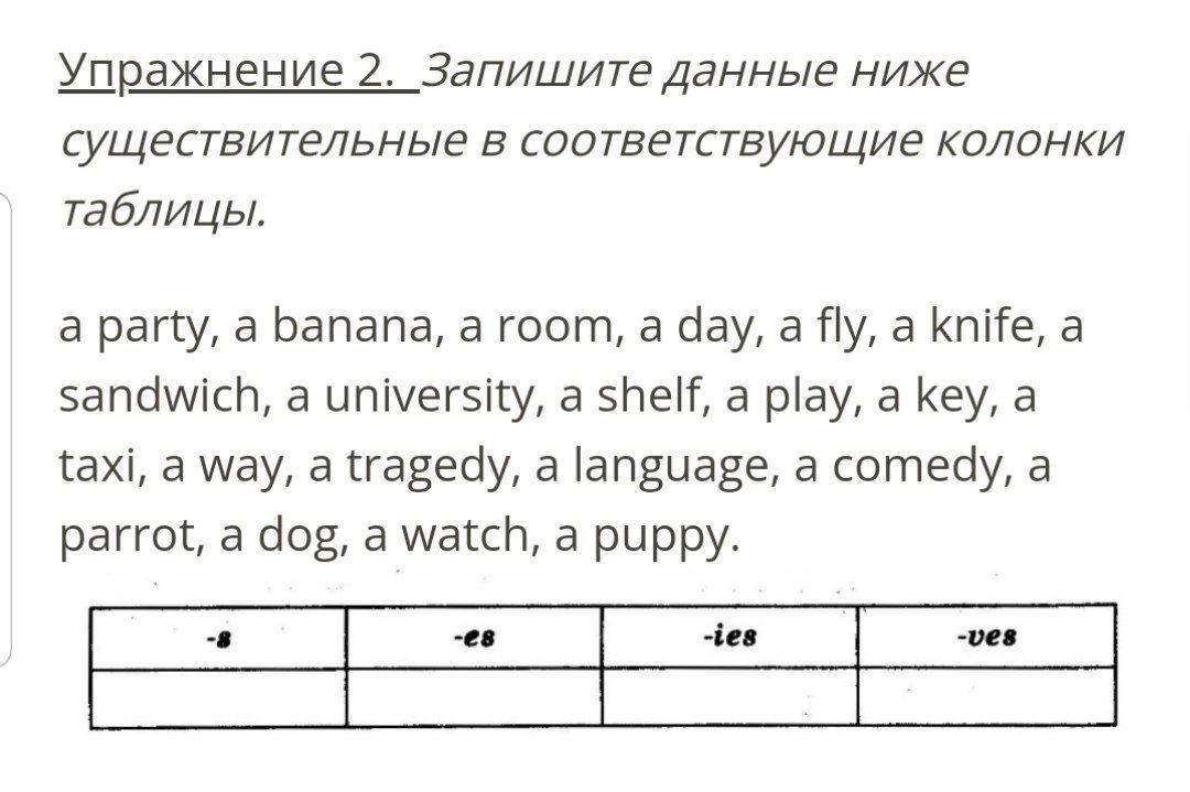parties, bananas, rooms, days, flies, knives, sandwiches, universities, shelves, plays, keys, taxis, ways, tragedies, languages, comedies, parrots, dogs, puppies