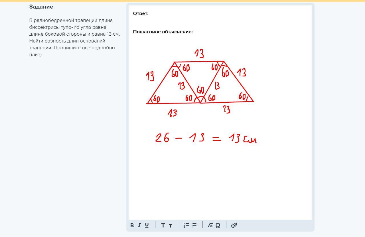 В равнобедренной трапеции длина биссектрисы тупо- го угла равна длине боковой стороны и равна 13 см. Найти разность длин оснований трапеции. Пропишите все подробно плиз)