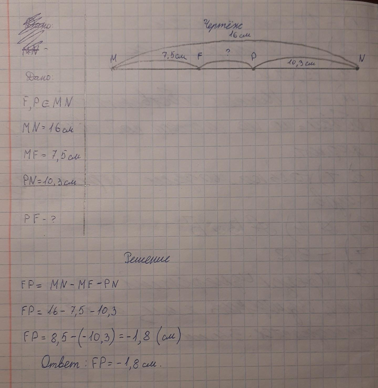 Чтобы узнать сколько отрезок FP мы должны из MN ( то есть самого отрезка на котором лежат точки F,P) вычесть MF и PN тем самым получаем отрезок FP
