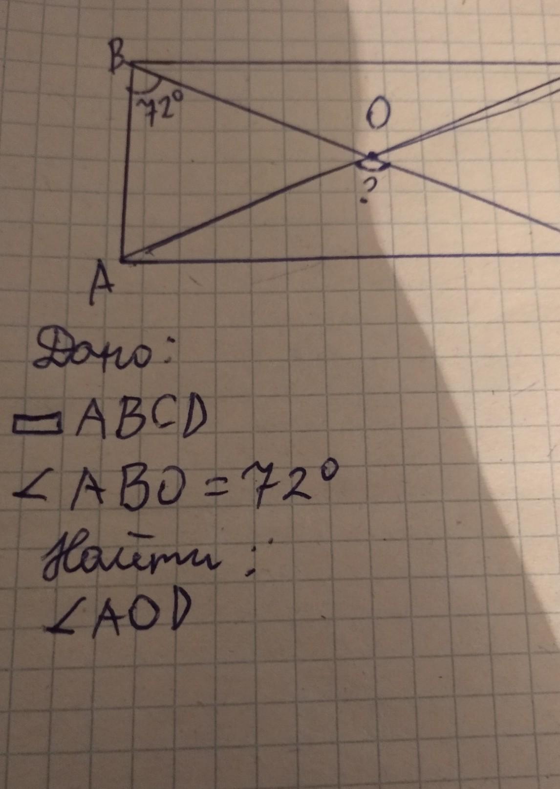 Так как углы прямоугольника равны 90°, а нам известно что угол ABO = 72°, то 90-72=18. Угол ОBA = BAO значит треугольник ВОА равнобедренный, а сумма углов треугольника равна 180°, 180-72×2=36. 180-36=144