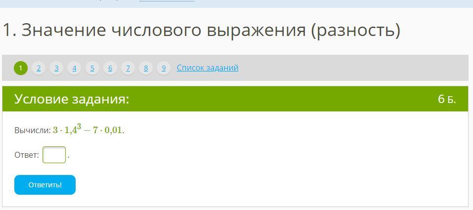 Вычисли: 3 ⋅ 1,4/3 − 7 ⋅ 0,01.