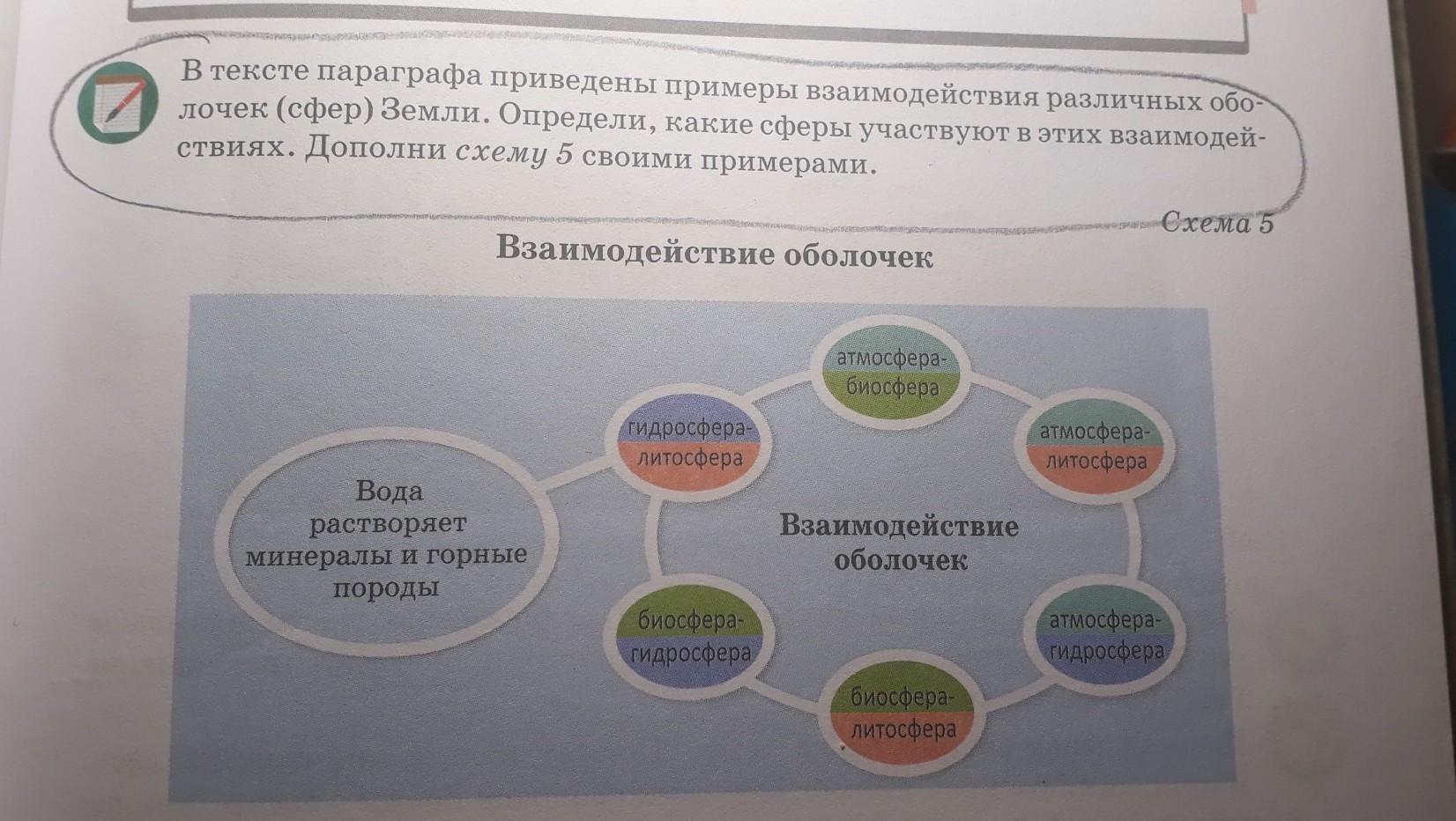 в тексте параграфа приведены примеры взаимодействия различных обо точек (сфер) Земли. Определи, какие сферы участвуют в этих взаимодей- ствиях. Дополни схему 5 своими примерами. Схема 5