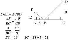 Человек,стоя на краю ручья,видит в трех метрах перед собой отражение вершины столба,высотой 9 м,который стоит на другом берегу ручья.Расстояние от земли до уровня глаз человека равно 1 м 50 см.Найдите расстояние от человека до столба.Ответ дайте в метрах.)