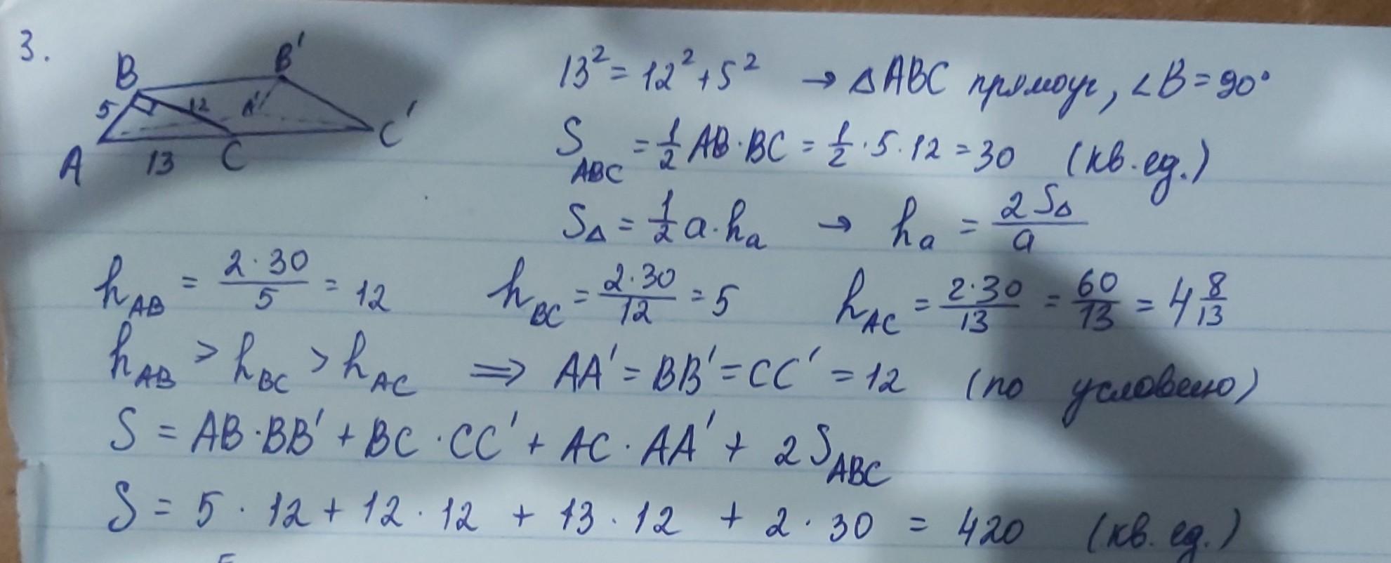 Стороны основания прямой треугольной призмы равны 12 см , 13 см и 5 см , а боковое ребро равно большей высоте основання . Найдите площадь полной поверхности призмы .