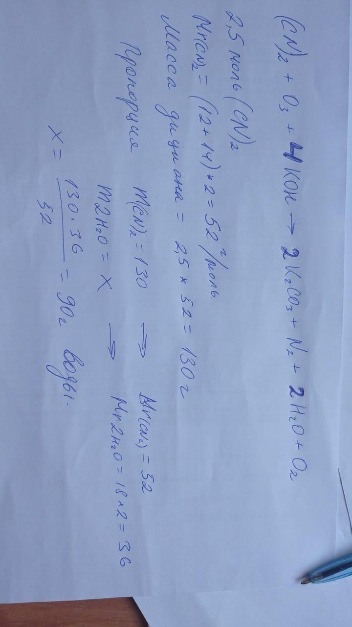Какая масса воды (в граммах) образуется в ходе реакции 2.5 моль дициана с необходимым количеством озона и щелочи? Считать молярную массу воды равной 18 г/моль.