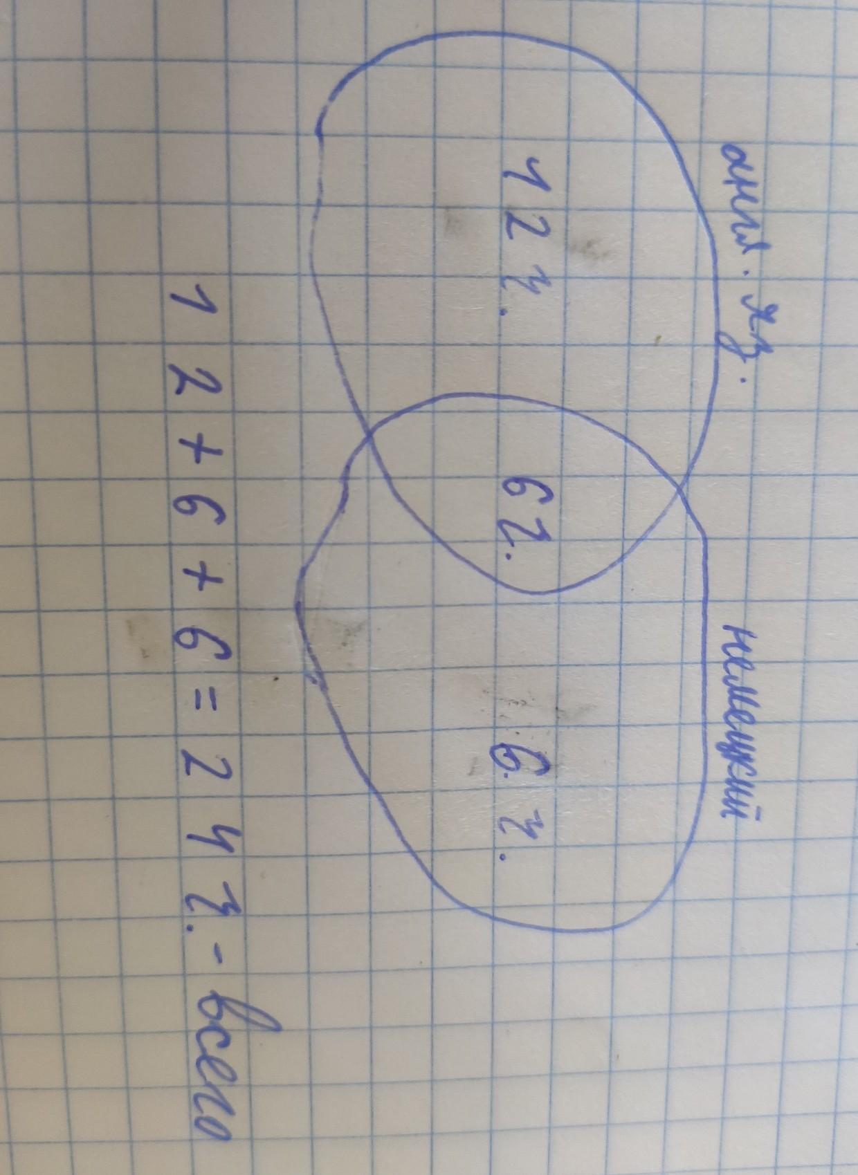 2. В классе английский язык изучают 18 учеников, а не- мецкий 12 учеников, причём 6 учеников изучают одновременно английский и немецкий языки. Сколько учеников в классе изучают только английский язык? Сколько всего учеников в классе? Изобрази мно- жества с помощью кругов Эйлера.