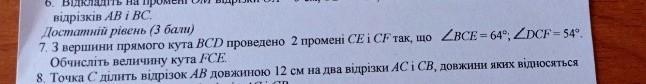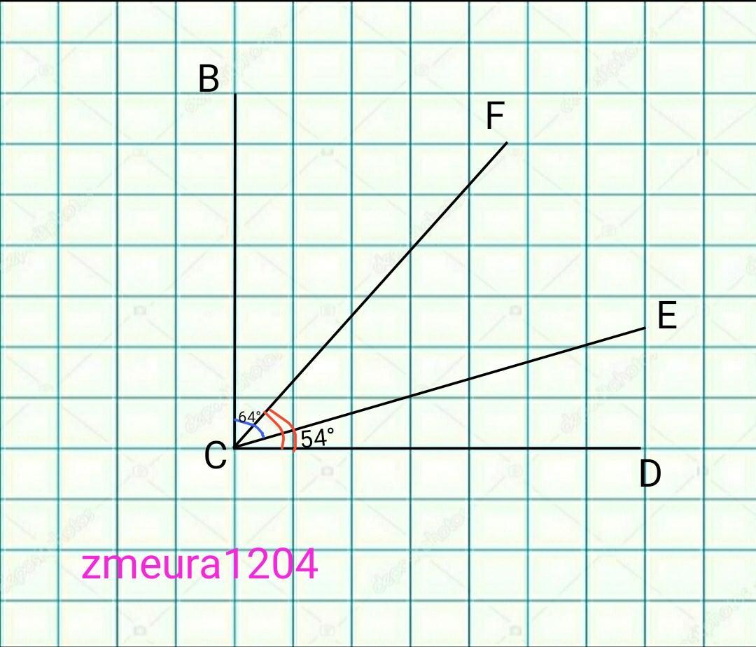 з вершини прямого кута ВСД проведено 2 промені СЕ і СF так , що кут ВСЕ= 64 градусів кут ДСF=54 обчисліть величину кута FCE