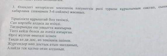 3.Өлеңдегі көтерілген мәселенің әлеуметтік рөлі туралы құрылымын сақтап,сыни хабарлама (шамамен 5-6 сөйлем) жасаңыз. помогите срочно пжж дам 75 балловв