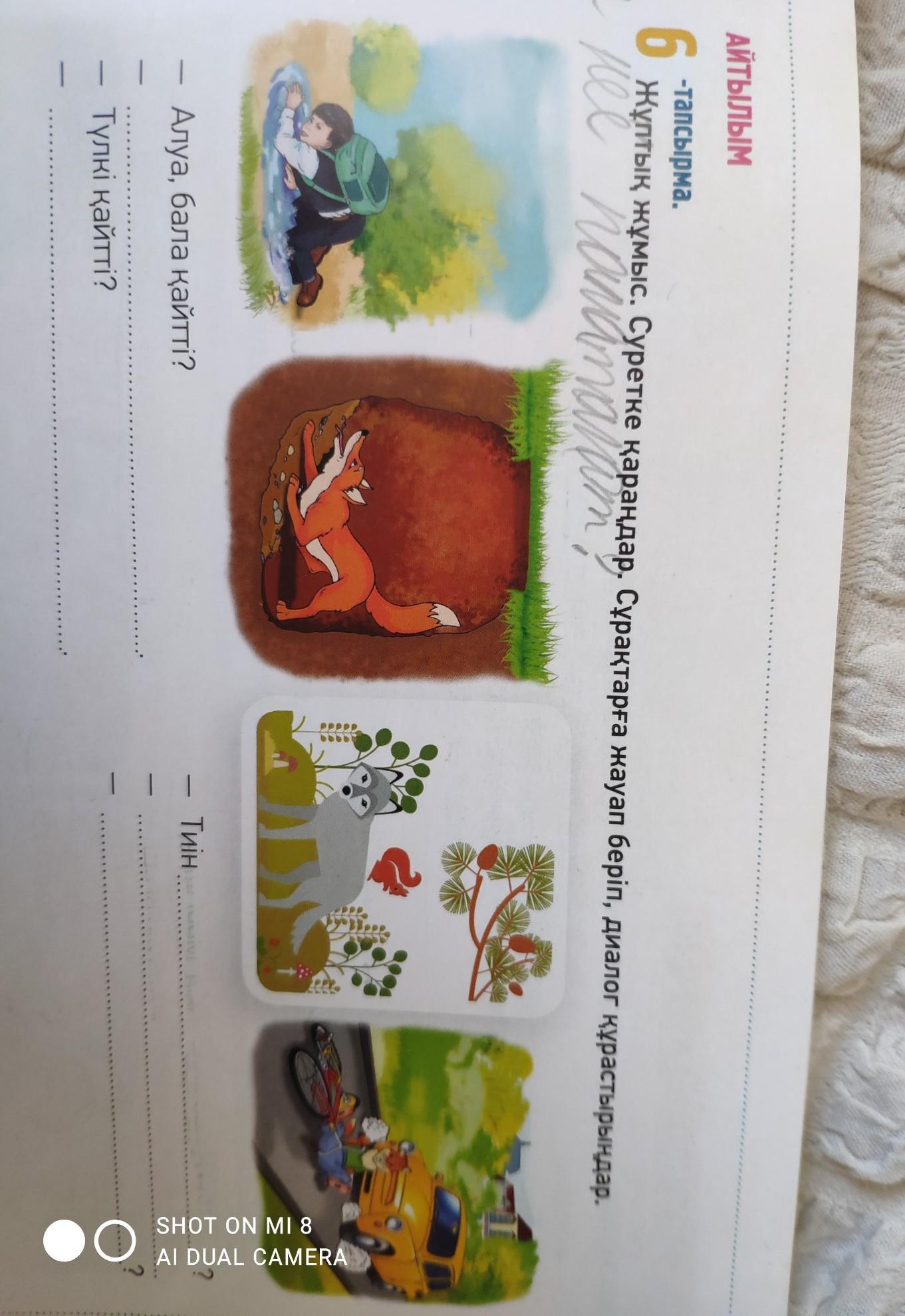 АЙТЫЛЫМ 6 -тапсырма. Жұптық жұмыс. Суретке қараңдар, Сұрақтарға жауап беріп, диалог құрастырыңдар.