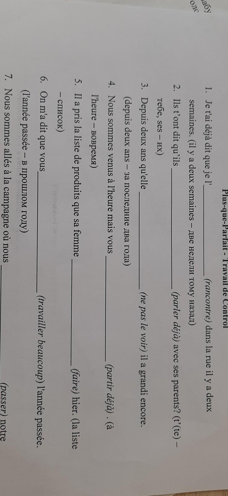 1.j'avais rencontré 2. avaient déjà parlé 3.ne l'avait pas vu 4. étiez déjà partis 5.avait fait 6. aviez beaucoup travaillé 7.avions passé