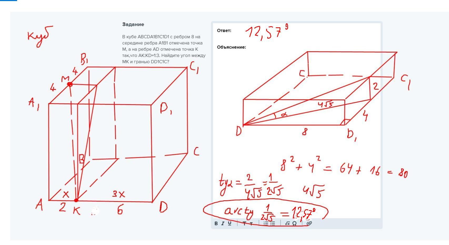 В кубе ABCDA1B1C1D1 с ребром 8 на середине ребра A1B1 отмечена точка М, а на ребре AD отмечена точка К так,что АК:KD=1:3. Найдите угол между MK и гранью DD1C1C?