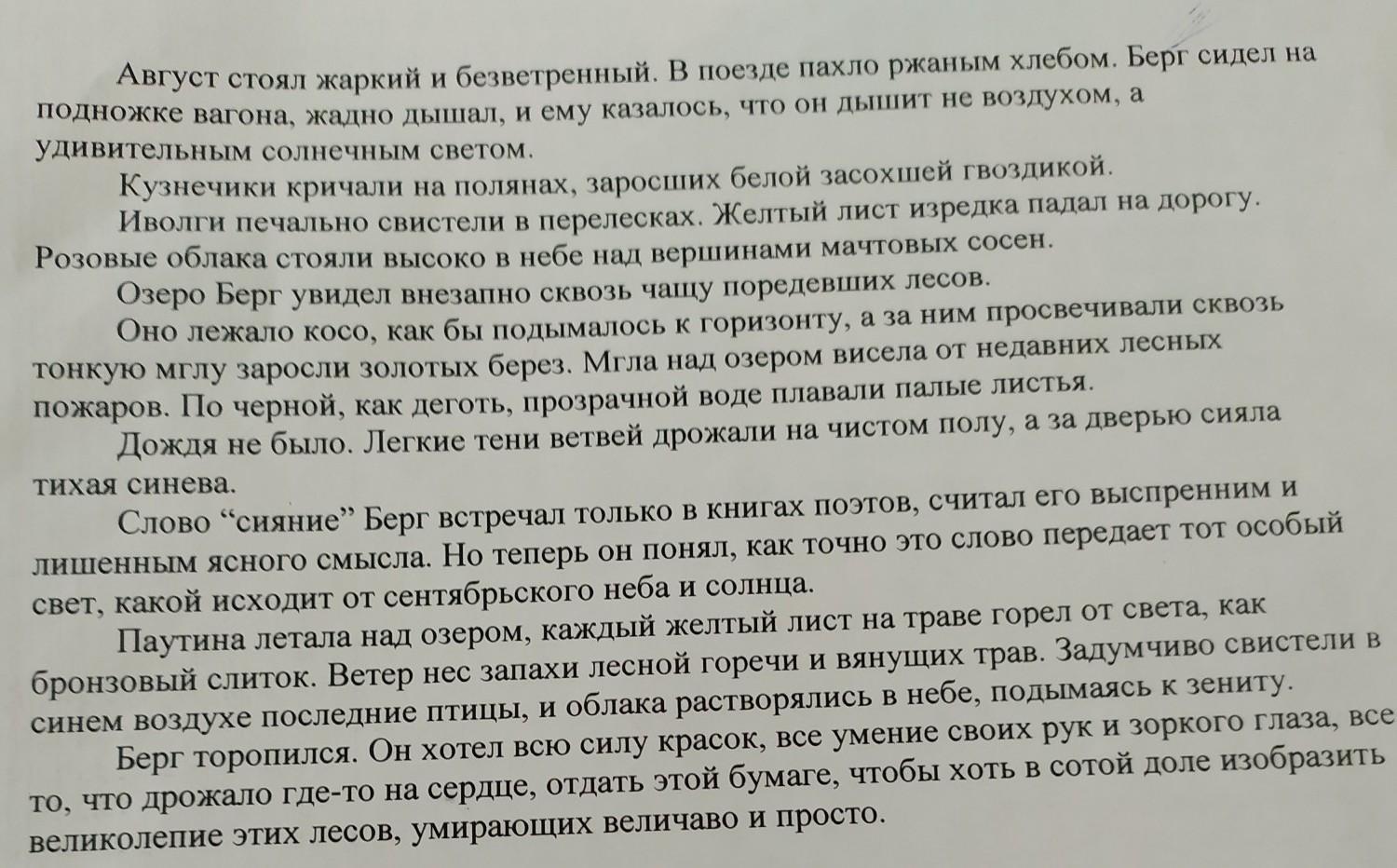 Прочитайте текст. 1. Проанализируйте текст: определите тему рассказа, жанровые особенности и изобразительно- выразительные средства. Аргументируйте свой ответ примерами из текста. 2. Представьте информацию в виде таблицы/ментальной карты. 3. Ответьте на вопрос «Как стал понимать слово «сияние» Берг?»