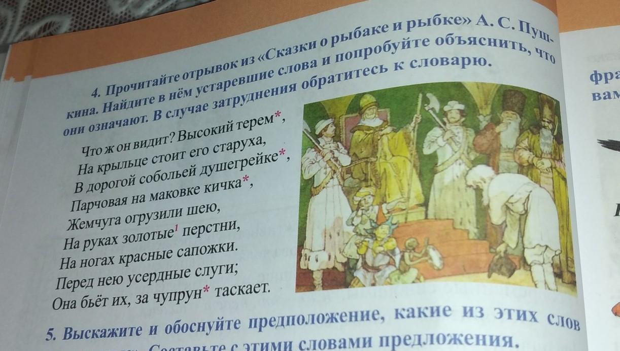 4. Прочитайте отрывок из «Сказки о рыбаке и рыбке» А. С. Пуш- кина. Найдите в нём устаревшие слова и попробуйте объяснить, что они означают. В случае затруднения обратитесь к словарю. Что ж он видит? Высокий терем, На крыльце стоит его старуха, В дорогой собольей душегрейке*, Парчовая на маковке кичка*, Жемчуга огрузили шею, На руках золотые перстни, На ногах красные сапожки. Перед нею усердные слуги; Она бьёт их, за чупрун* таскает.
