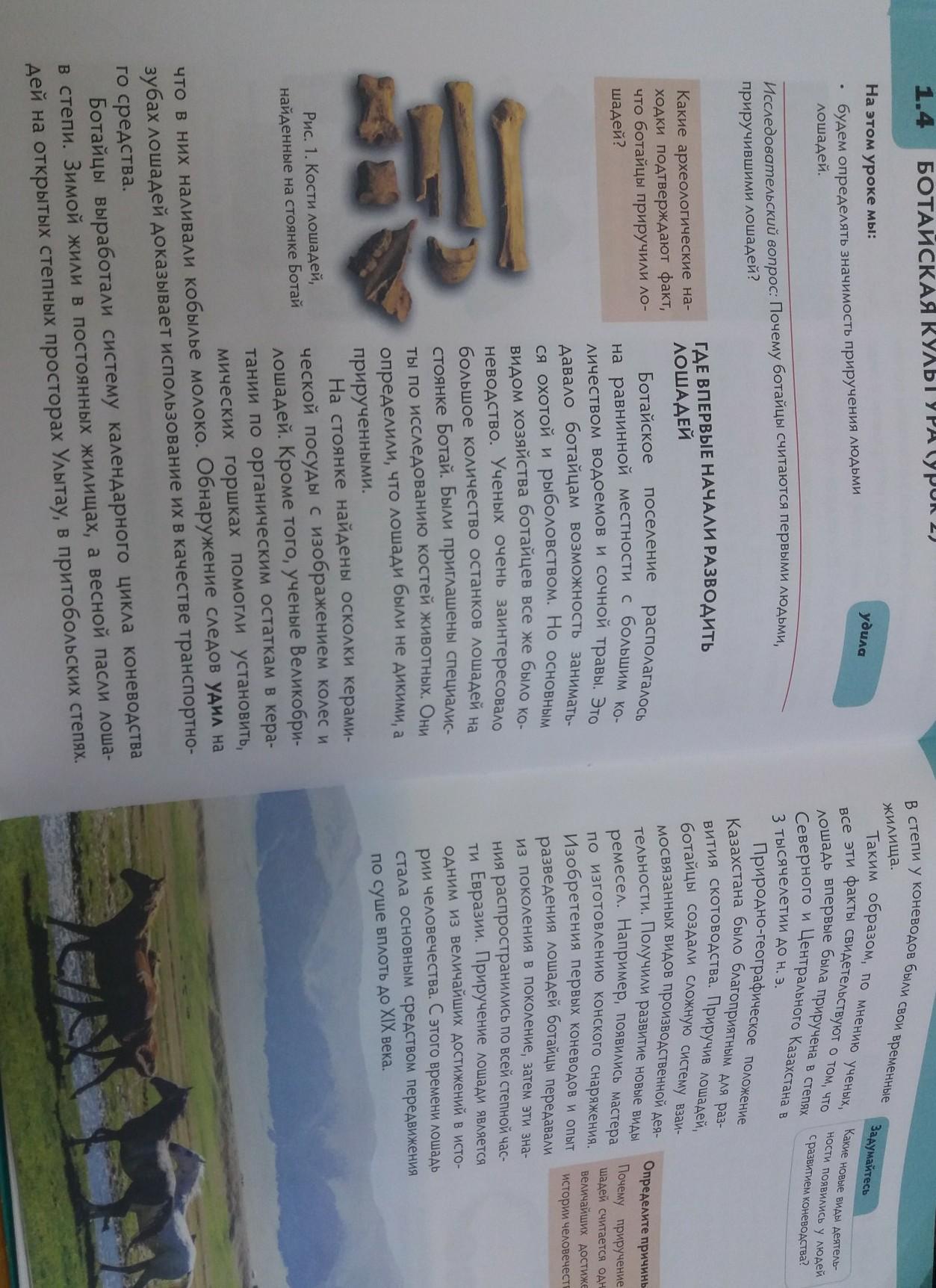 Стоянки: Жезказган, Зыряновск. Ботайская культура.Бронза – 2-1 тыс. лет до н.э. Имущественное неравенство. Патриархально семейно-родовые отношения. Двугорбый верблюд – бактриана. Вытеснение камня. Свыше 30 поселений и 150 могильников в центральном Казахстане. Появление кочевого скотоводства. Землянки и полуземлянки. Говорили на индо-иранском. Погребение в согнутом виде. Плавильные печи (р. Атасу). Чеканка, литье, штамповка, ковка. Метод «огневой проходки». Царь — первая борозда. Малахай — гол. убор. Земледелие – вспомогательная роль