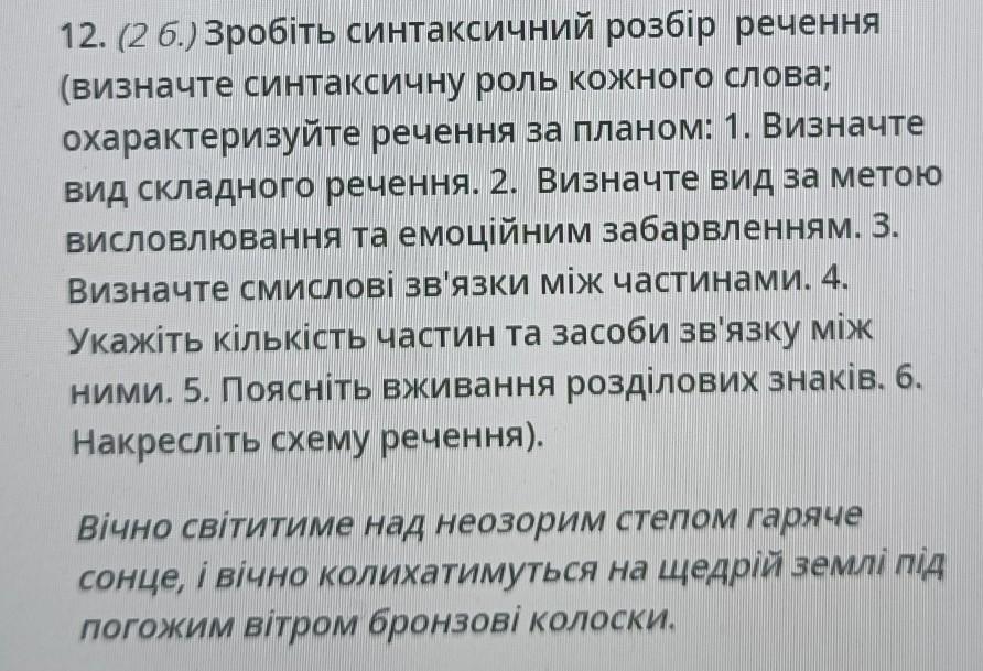 Вічно(обставина -•-) світитиме (присудок =) над неозорим( означення ~) степом(обставина -•-) гаряче(означення ~) сонце(підмет –), і вічно(обставина -•-) коливатимуться(присудок =) на щедрій(означення ~) землі(обставина -•-) під погожим(означення ~) вітром(додаток--) бронзові(означення ~) колоски(підмет –).