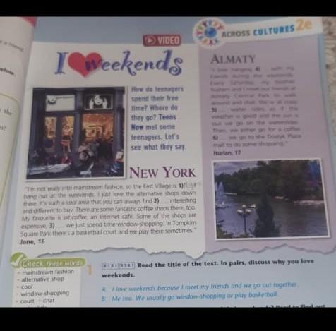 Read the title of the text. In pairs, discuss why you love weekends. A: I love weekends because I meet my friends and we go out together. B: Me too. We usually go window-shopping or play basketball.