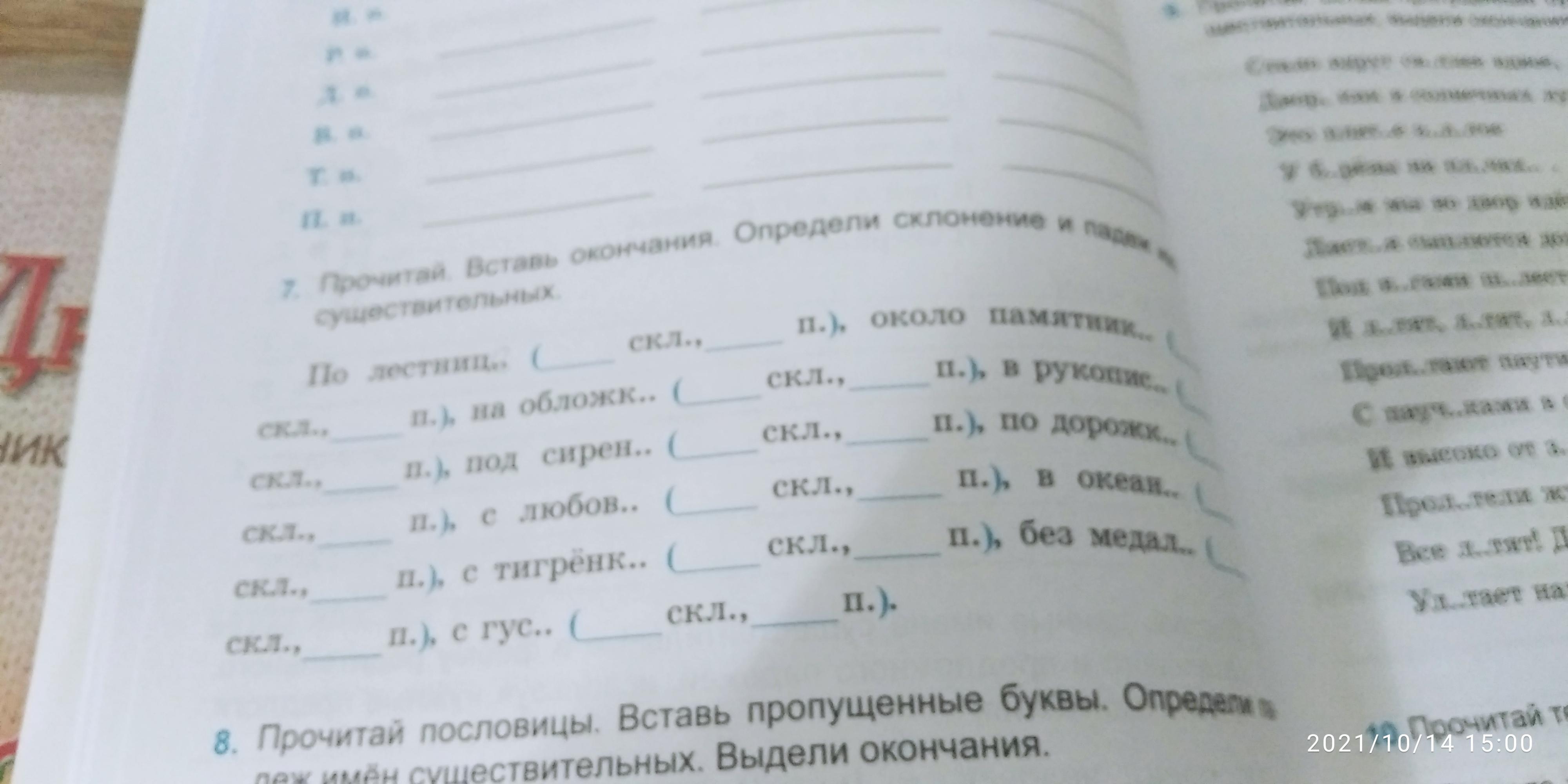по лестнице (1 скл, Д.п), около памятника (2 скл, Р.п), на обложке (1 скл, П.п), в рукописи (3 скл, П.п), под сиреной (1 скл, Т.п), по дорожке (1 скл, Д.п), с любовью (3 скл, Т.п), в океане (2 скл, П.п), с тигренка (2 скл, Р.п), без медали (3 скл, Р.п), с гусём (2 скл, Т.п).