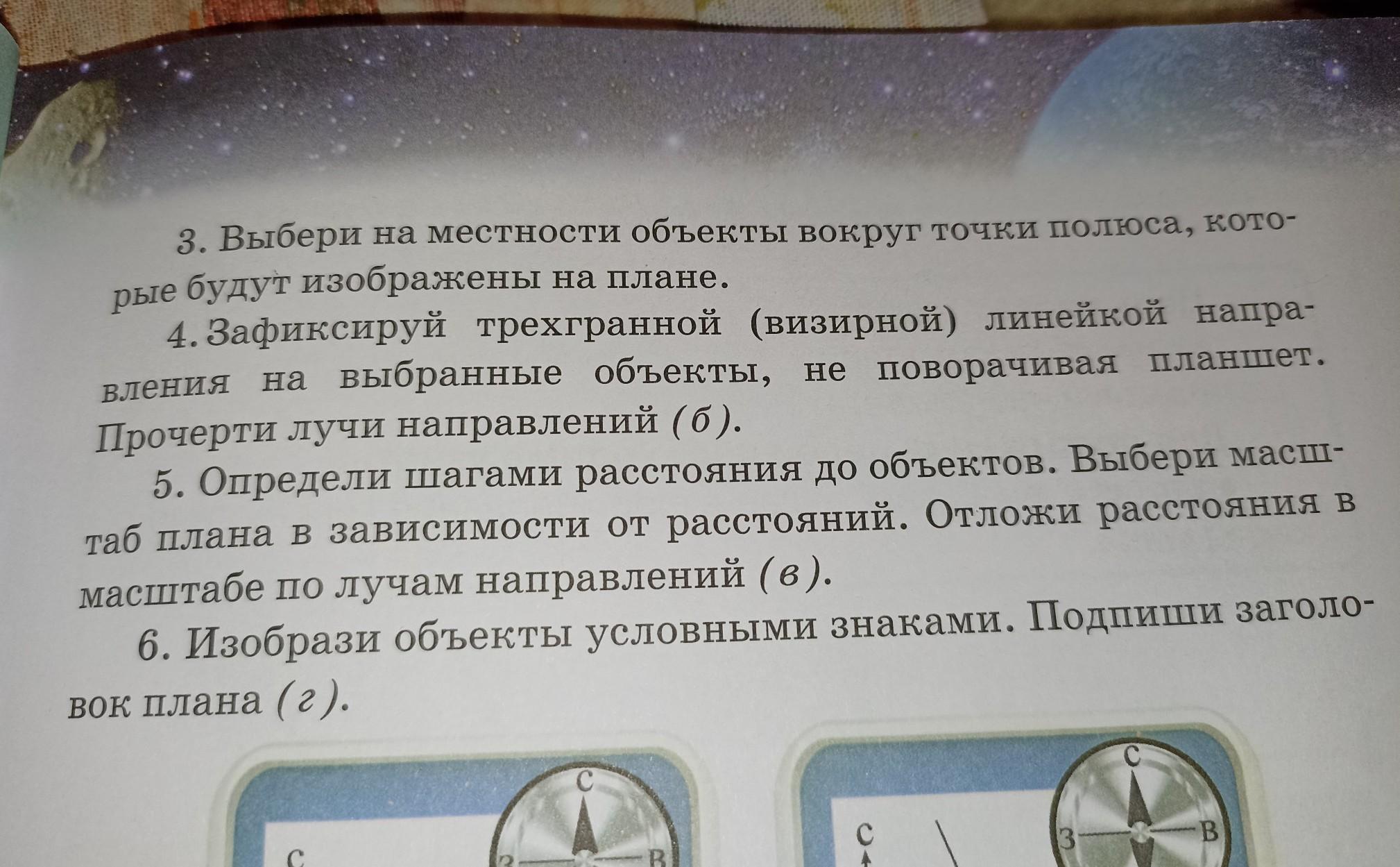 Подготовь планшет с прикрепленным к нему компасом и листом бумаги а