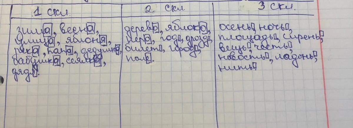 слова:зима,весна,осень,дерево,улица,ночь,яблоко,яблоня,река,перо,год,дрозд,площадь,сирень,билет,билет,город,папа,дедушка,бабушка,вещь,честь,поле,новость,сеялка,дядя,ладонь,нить.