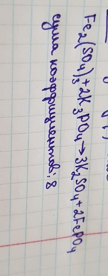 Сумма коэффициентов в уравнении реакции между водными растворами сульфата железа (III) и фосфата калия равна