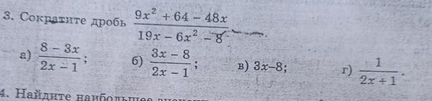 =\frac{9x^{2} -48x+64}{-6x^{2} +19x-8} =\frac{3x-8)^{2} }{-6x^{2} +16x+3x-8} =\frac{(3x-8)^{2} }{-2x(3x-8)+3x-8} =\frac{(3x-8)^{2} }{(3x-8)(-2x+1)} =\frac{3x-8}{-2x+1}