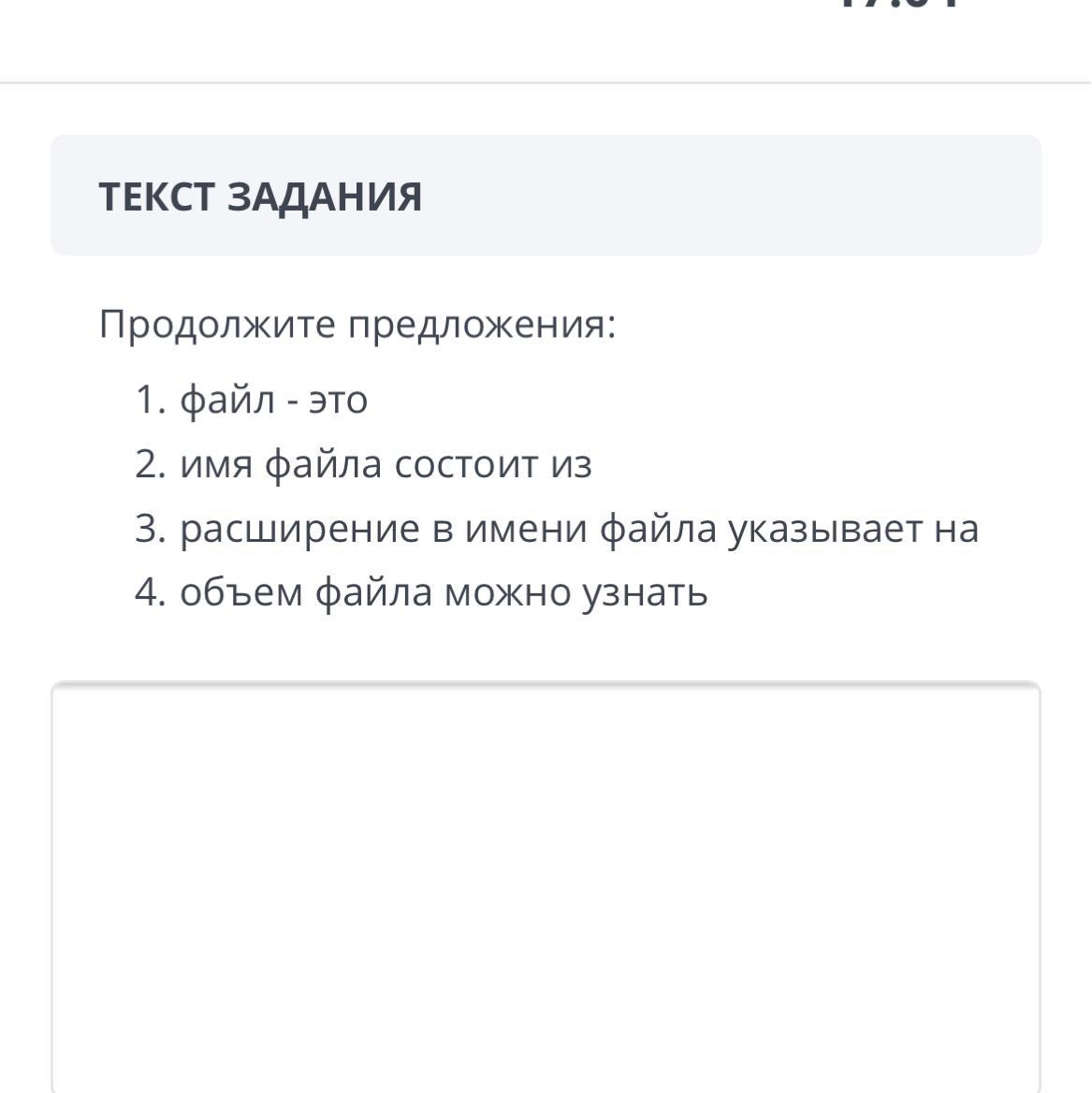 Продолжите предложения: 1. Файл-это 2.имя файла состоит из 3. Расширение в имени файла 4. Объём файла можно узнать