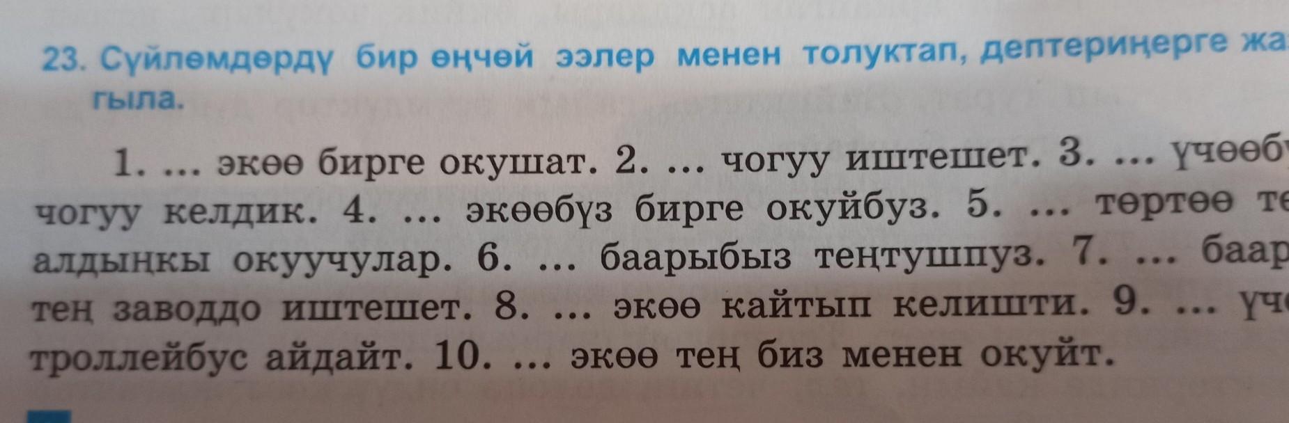 Ответ:1) Саша менен Адиль экоо бирге окушат. 2) Акылай жана Азим чогуу иштешет. 3) Мен, Бегимай жана Мээрим учообуз чогуу келдик. 4) Сания экообуз бирге окуйбуз
