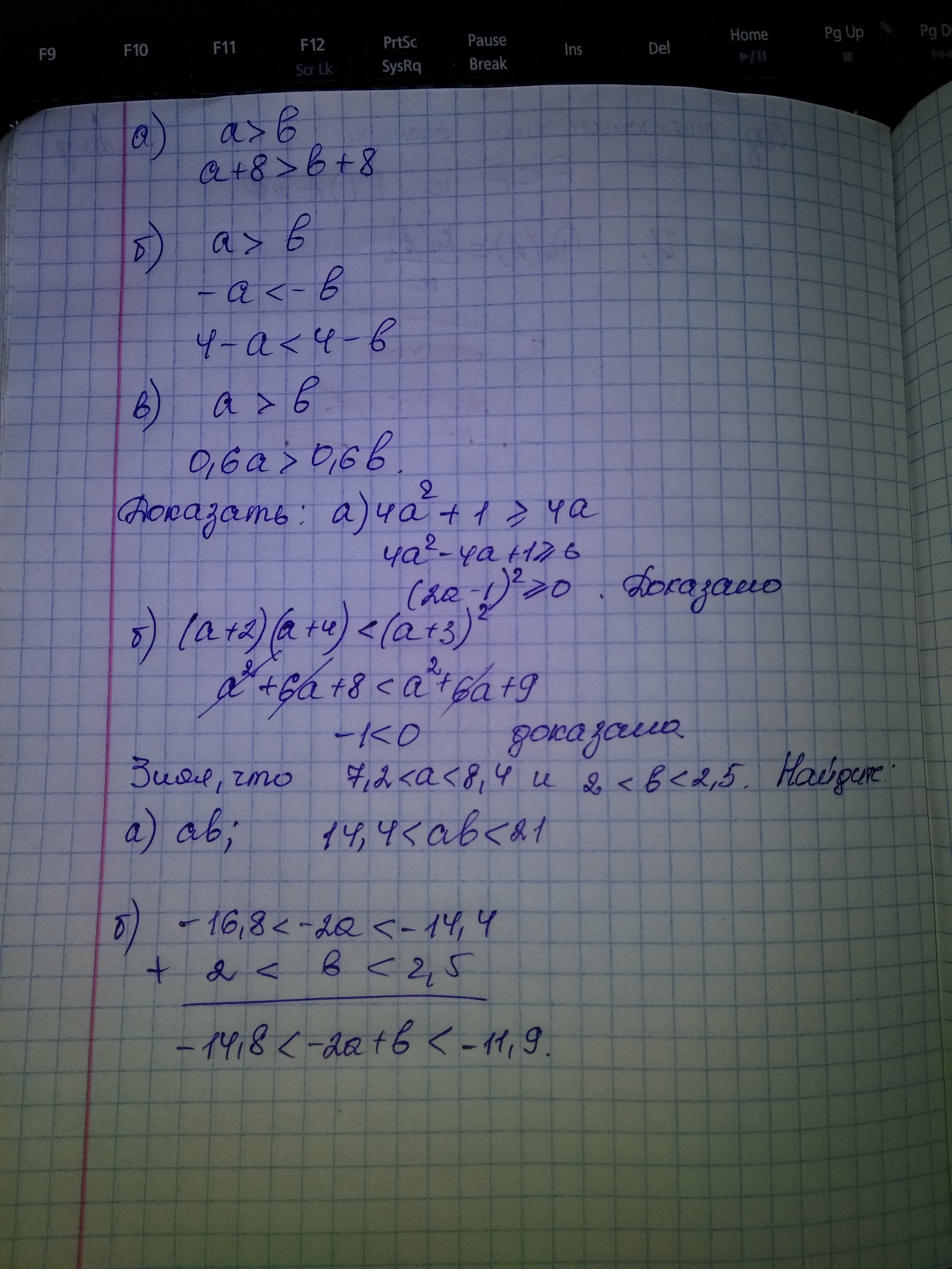 Известно, что a > b. Сравните: а) а + 8 и b + 8; в) 4 – а и 5 – b. б) 0,6а и 0,6b; Докажите неравенство: а) 4а2 + 1 4а; б) (а + 2)(а + 4) < (а + 3)2. Зная, что 7,2 < а < 8,4 и 2 < b < 2,5, оцените: а) ab; б) –2а + b; в) .
