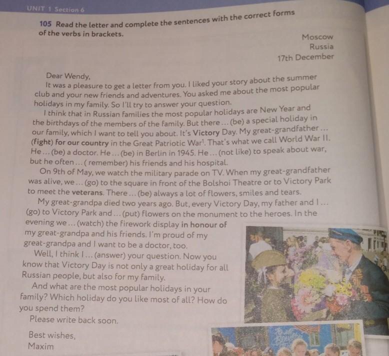 I think that in Russian families the most popular holidays are New Year and the birthdays of the members of the family. But there is a special holiday in our family, which I want to tell you about. It’s Victory Day. My great−grandfather fought for our country in the Great Patriotic War. That’s what we call World War II. He was a doctor. He was in Berlin in 1945. He didn't like to speak about war, but he often remembered his friends and his hospital.