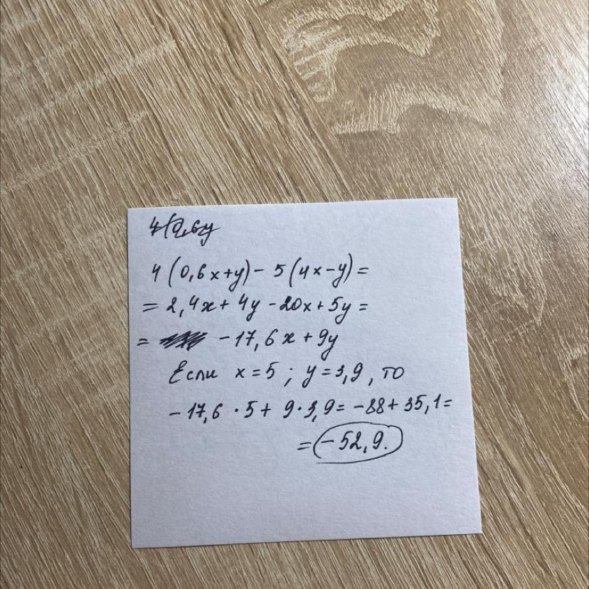 упрости выражение 4(0,6x+y)-5(4x-y) и найди его значение, если x=5 и y=3,9