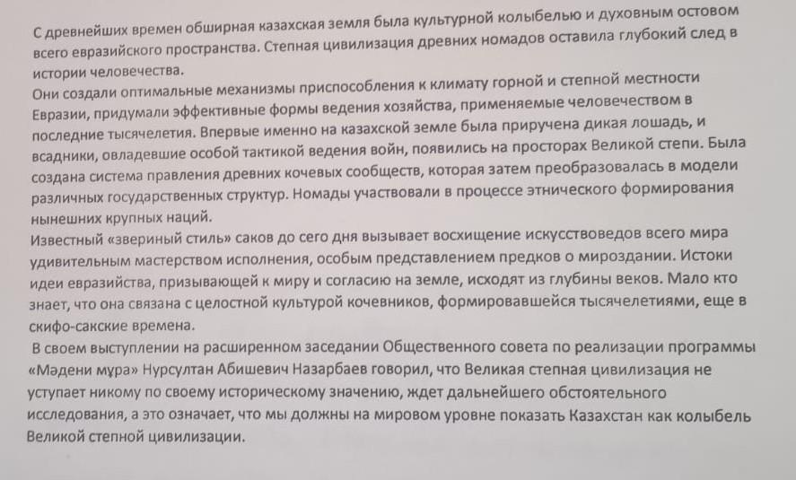 в выступлении *мадени мура* н.назарбаев говорил:*степная цивилизация не уступает никому по историческому значению-значит люди должны показать Казахстан как ее колыбель*.