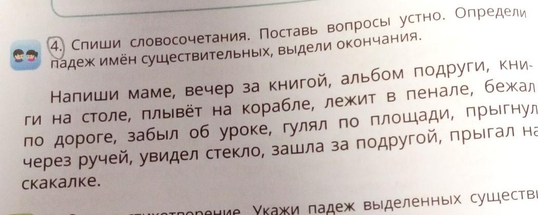 Определи падеж имён существительных , выдели окончание. Напиши мамЕ ( д.п.), вечер за книгой ( ой, тв.п.) , альбом подруги ( и, р.п) , бежал по дороге( е, дат.п. ) , забыл об уроке( е, п.п.) , гулял по площади( и, дат. ) , прыгнул через ручей [] ( вин. ) , увидел стекло( о, вин.) , зашла за подругой( ой, тв. ) , прыгал на скакалке ( е, п. п. ) лежит на пенале ( п.п., е).