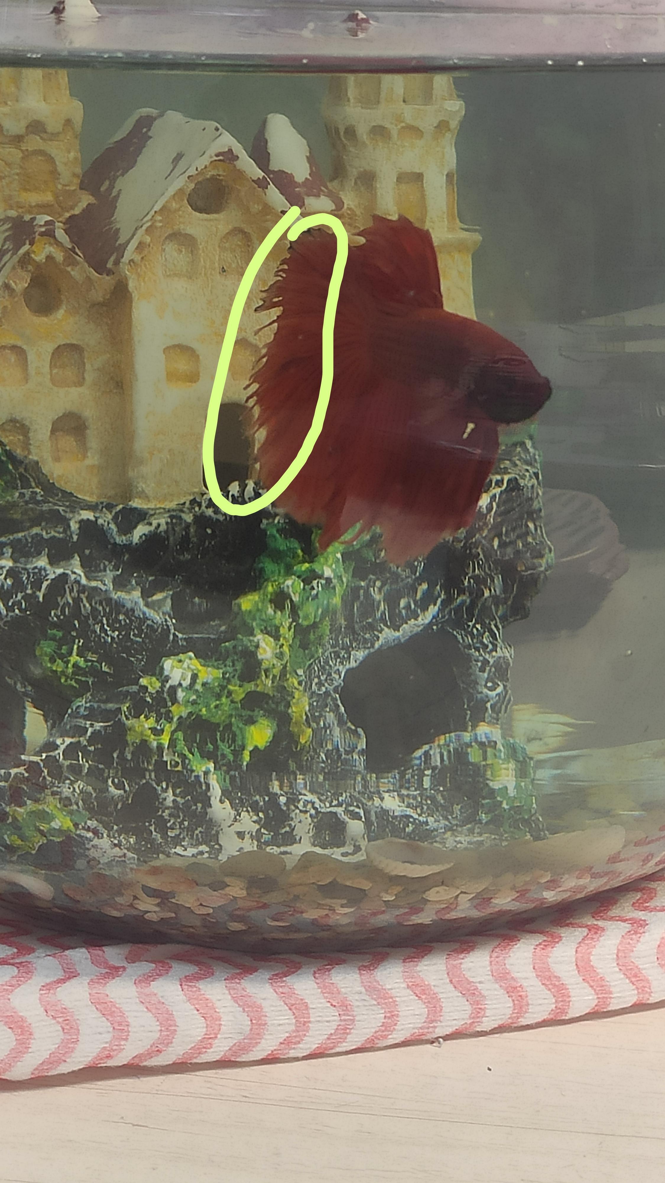 Рыбка петушок помогите хвост рвется (фото прикреплено). Кушает хорошо иногда ложится на дно. Купила не давно в оквариуме дом и грунт. Корм сухой.