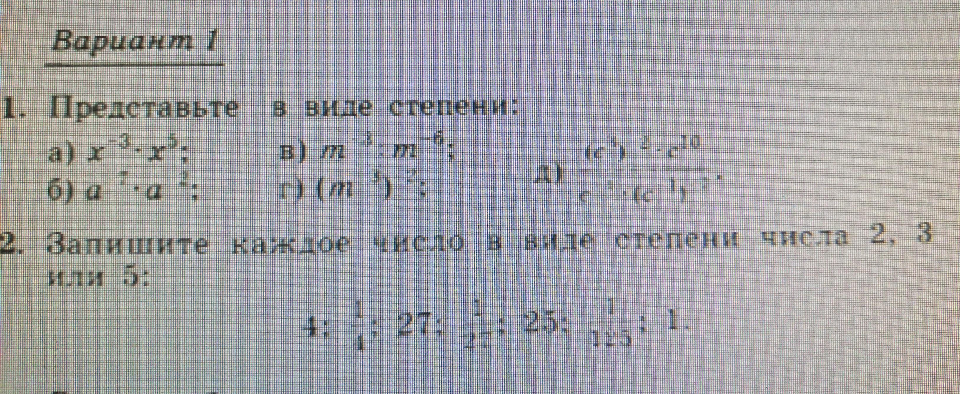 1 . а ) x⁻³ * x⁵ = x⁻³⁺⁵ = x² ; г ) ( m³ )⁻² = m⁻⁶ ;
