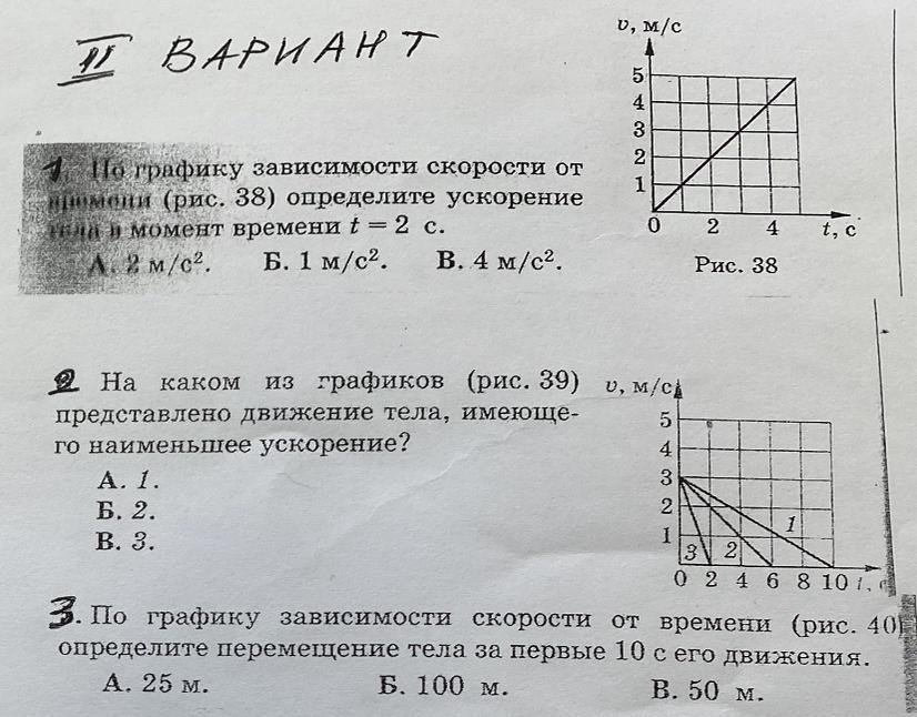 1 задание: ускорение (a) = v/t = 2м/2с = 1 м/c^2, следовательно, ответ "Б".