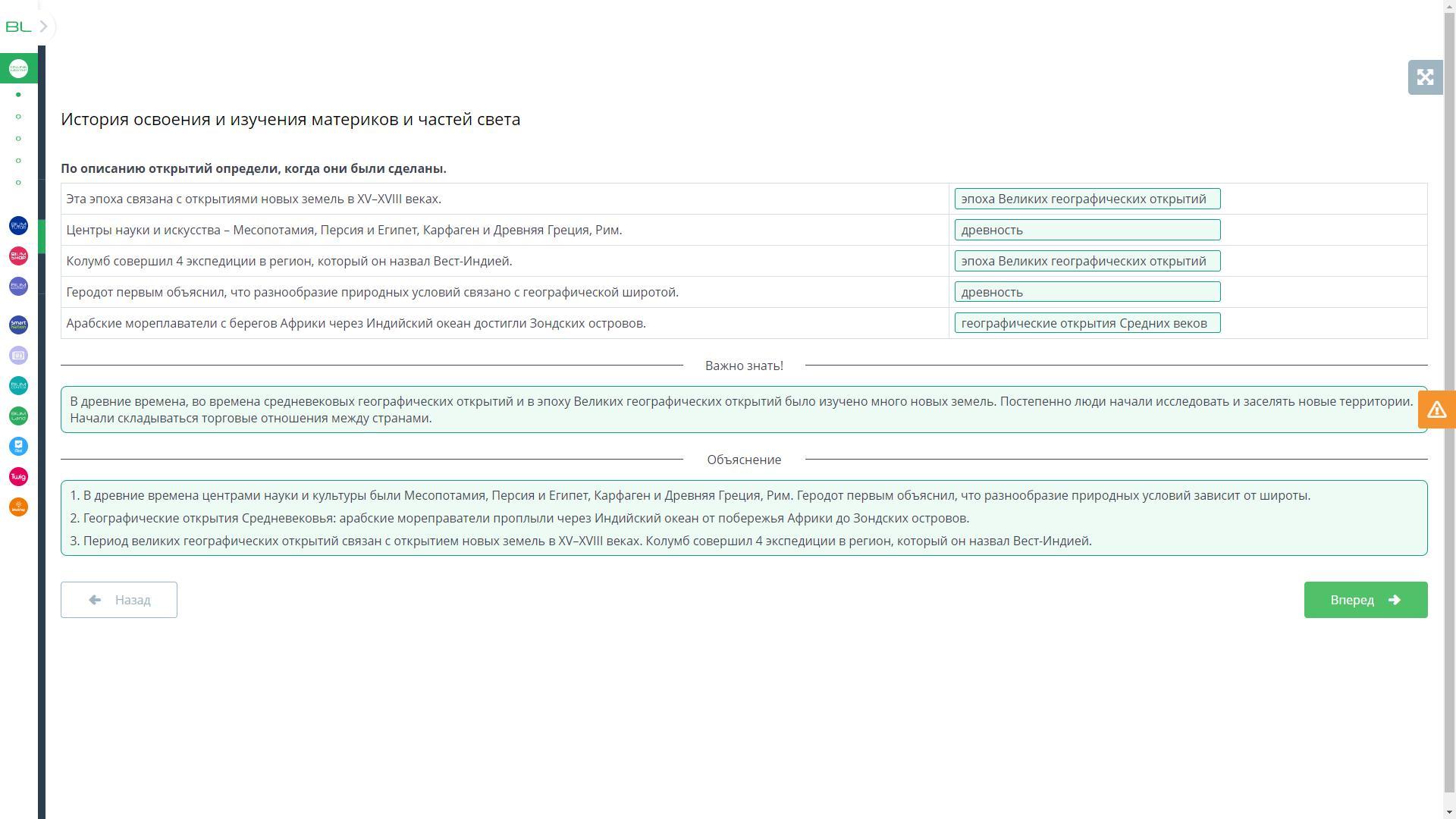 По описанию открытий определи, когда они были сделаны. Эта эпоха связана с открытиями новых земель в ХV–ХVІІІ веках. Центры науки и искусства – Месопотамия, Персия и Египет, Карфаген и Древняя Греция, Рим. Колумб совершил 4 экспедиции в регион, который он назвал Вест-Индией