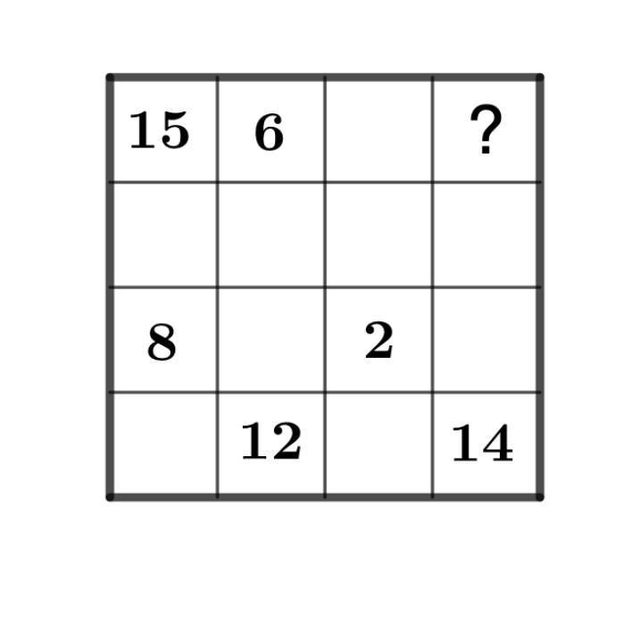 Магический квадрат В магическом квадрате стоят все числа от 1 до 16, причем сумма чисел, стоящих в каждой строке, каждом столбце и на каждой из двух главных диагоналей, должна быть одинаковой. На рисунке магический квадрат заполнен частично. Найдите, чему равна сумма в строчке, а также, какое число стоит в выделенной клеточке.