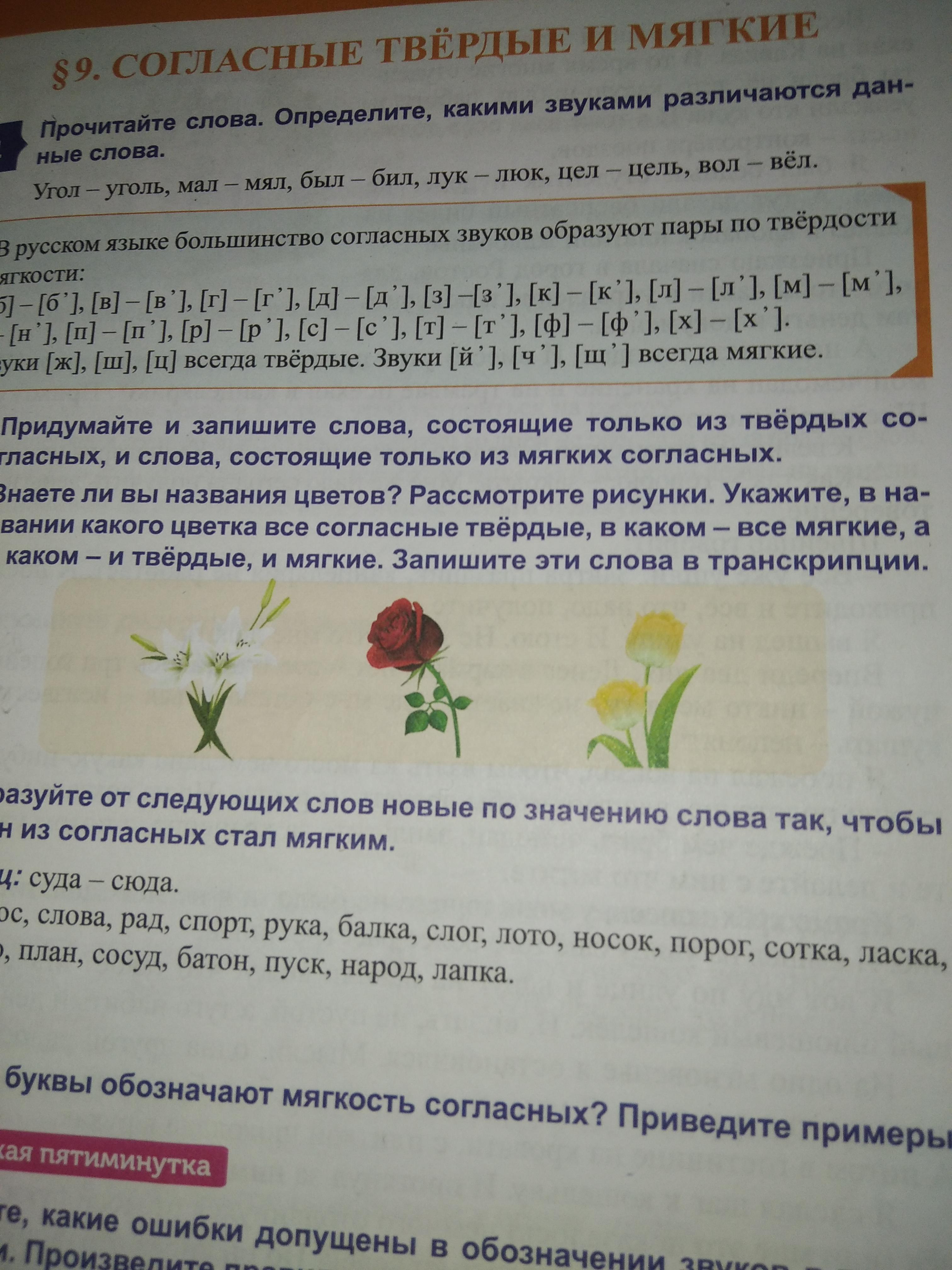 Знаете ли вы названия цветов? Рассмотрите рисунки. Укажите, в названии какого цветка все согласные и твёрдые, в каком - все мягкие, а в каком - и твёрдые, и мягкие. Запишите эти слова в транскрипции